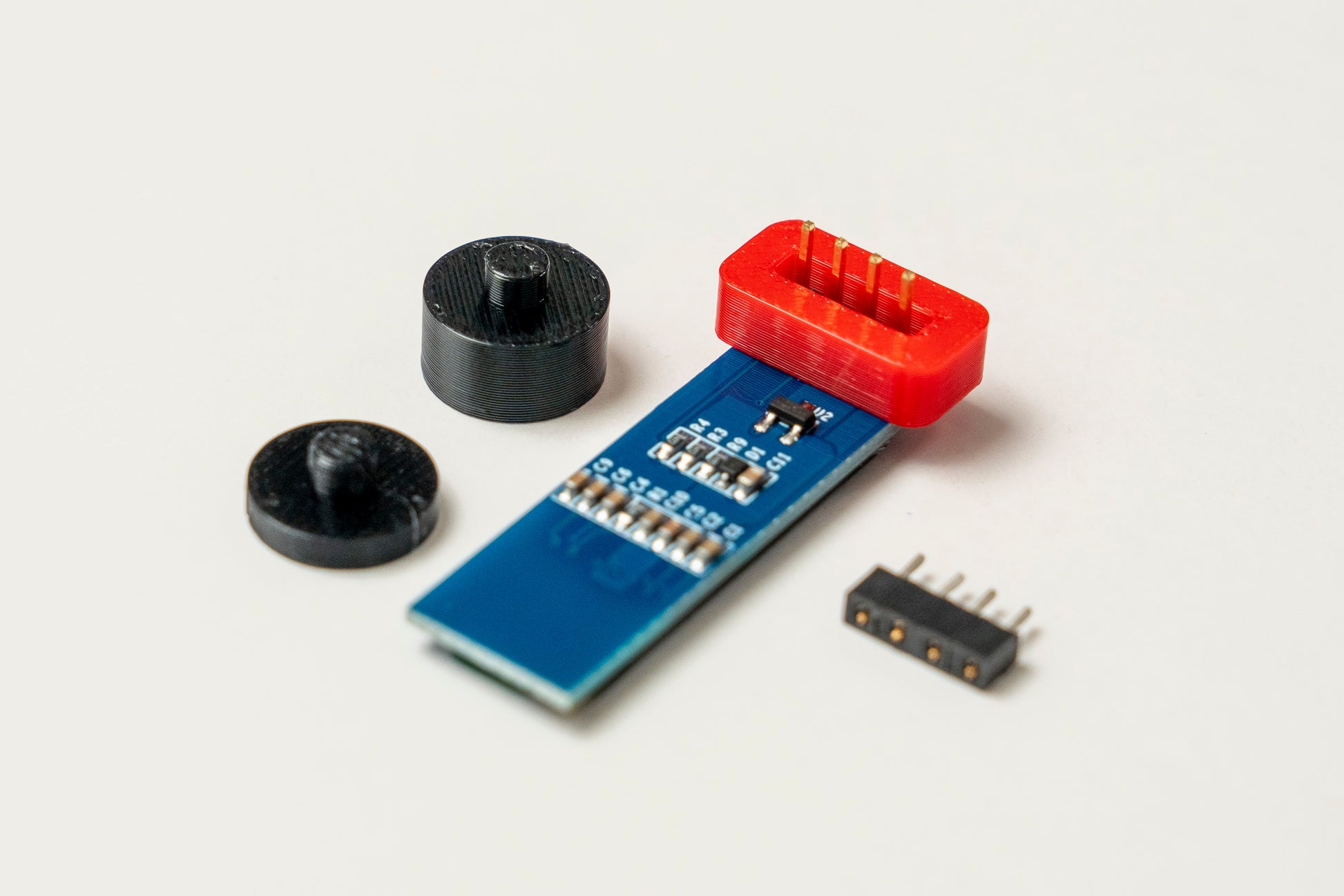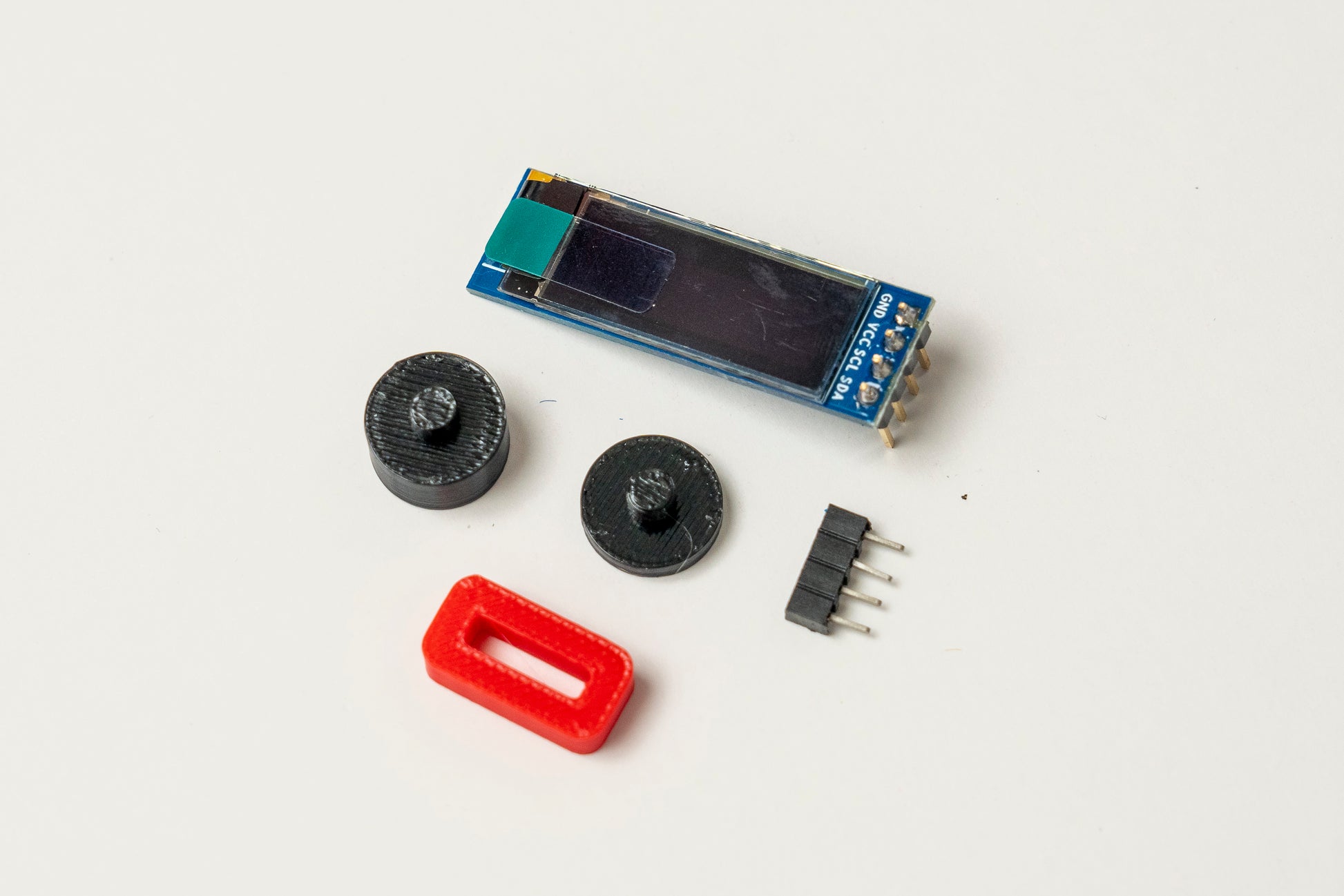 キットには標準的なOLEDヘッダーの高さと4ピンソケットの高さを支えるスタンドオフ2本も含まれています。さらに、ヘッダーを自身で取り付ける方向けに、ピンを適切な長さに切り詰めるための赤いガイドも提供されています。