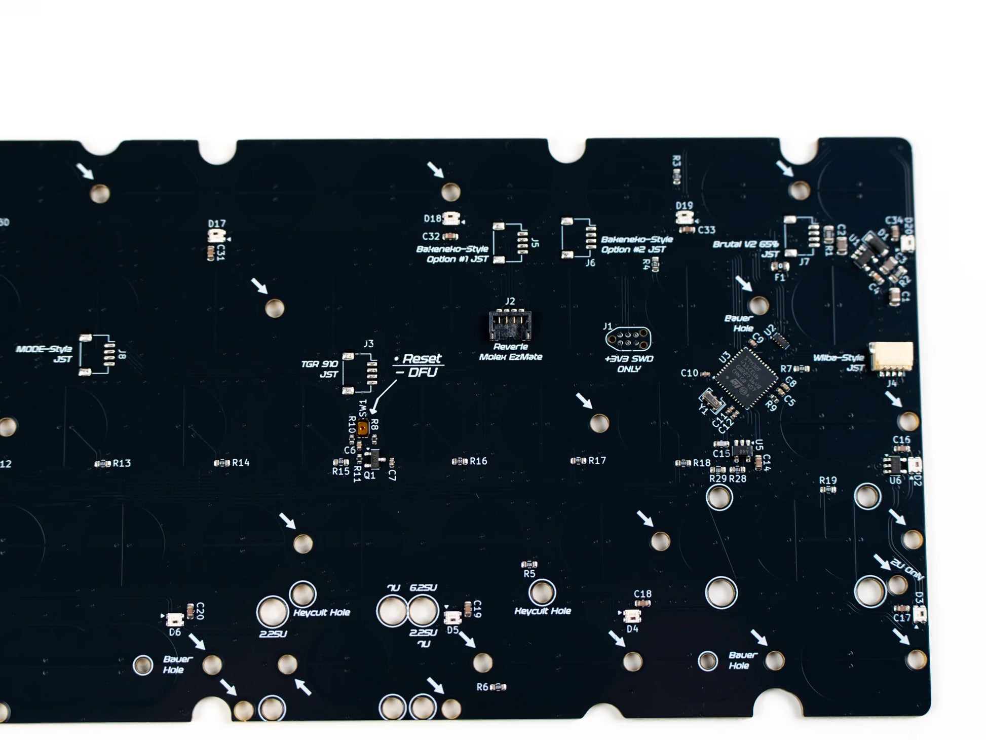 - JST & Molex header pre-soldered in WIlba position (Bakeneko65, Brutal V2, TGR 910, and Mode65 positions available through soldering. Image of locations here.)